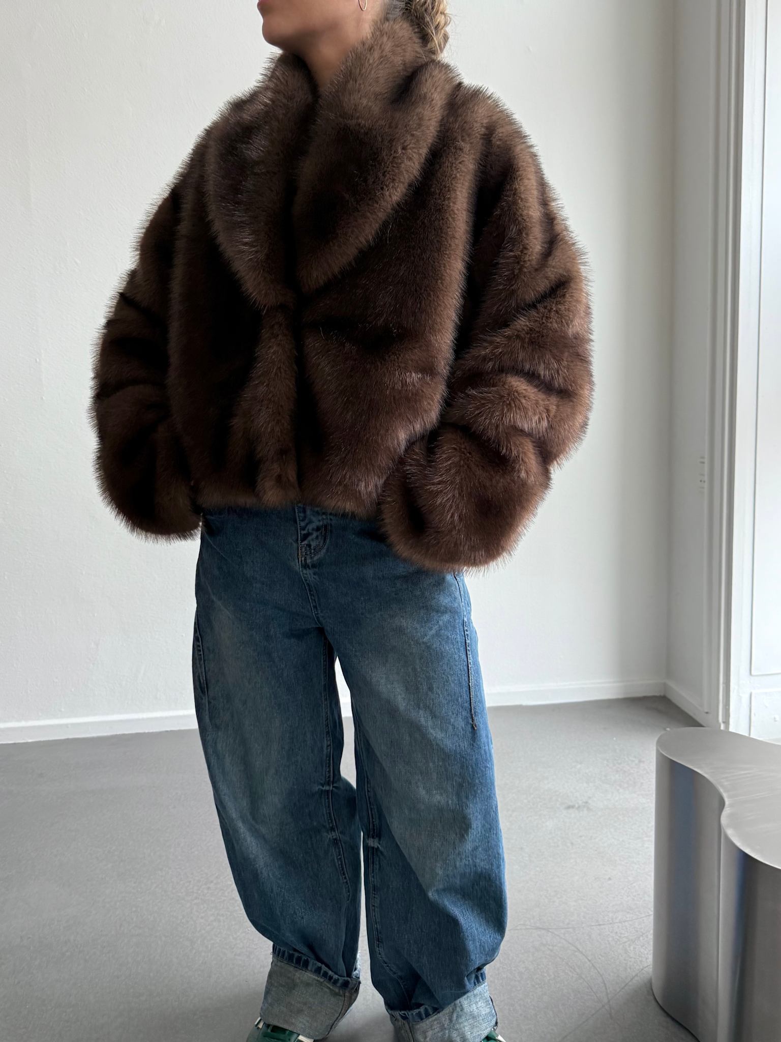 The Katha Faux Fur Jacket is crafted for an oversized silhouette in plush faux fur with a soft hand feel. Designed with a wide lapel collar and seamless hidden closure, wide sleeves complete the design, adding subtle volume. Size down for a closer fit.
