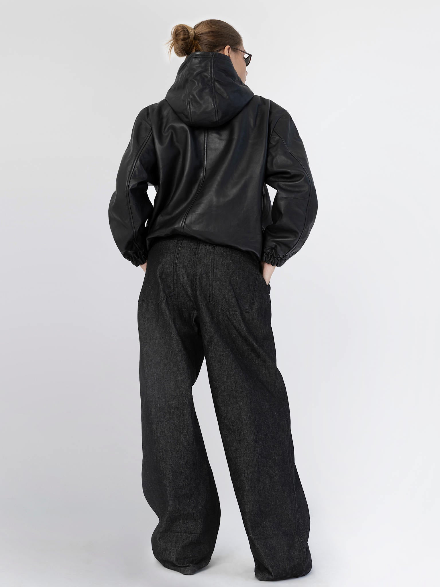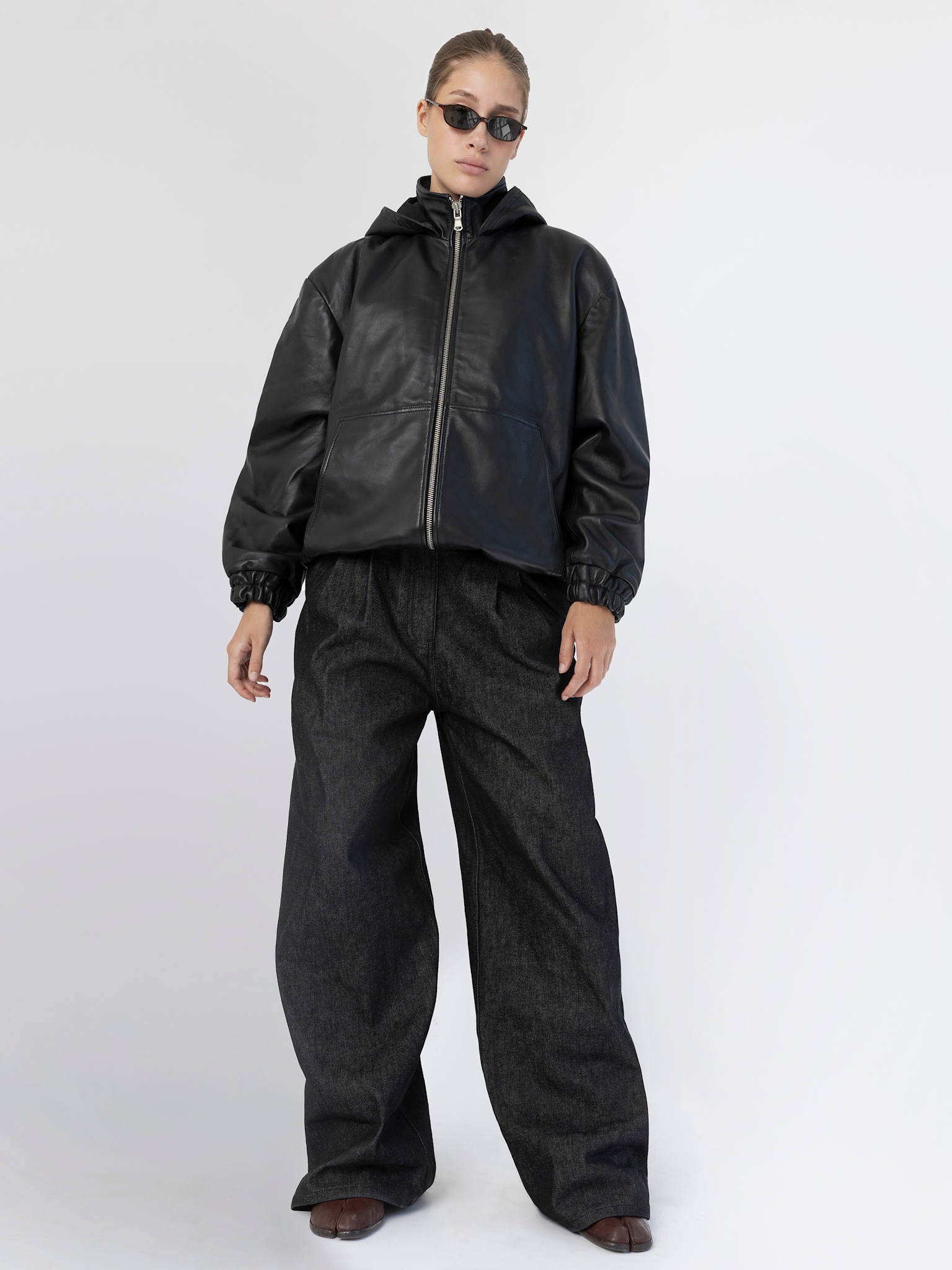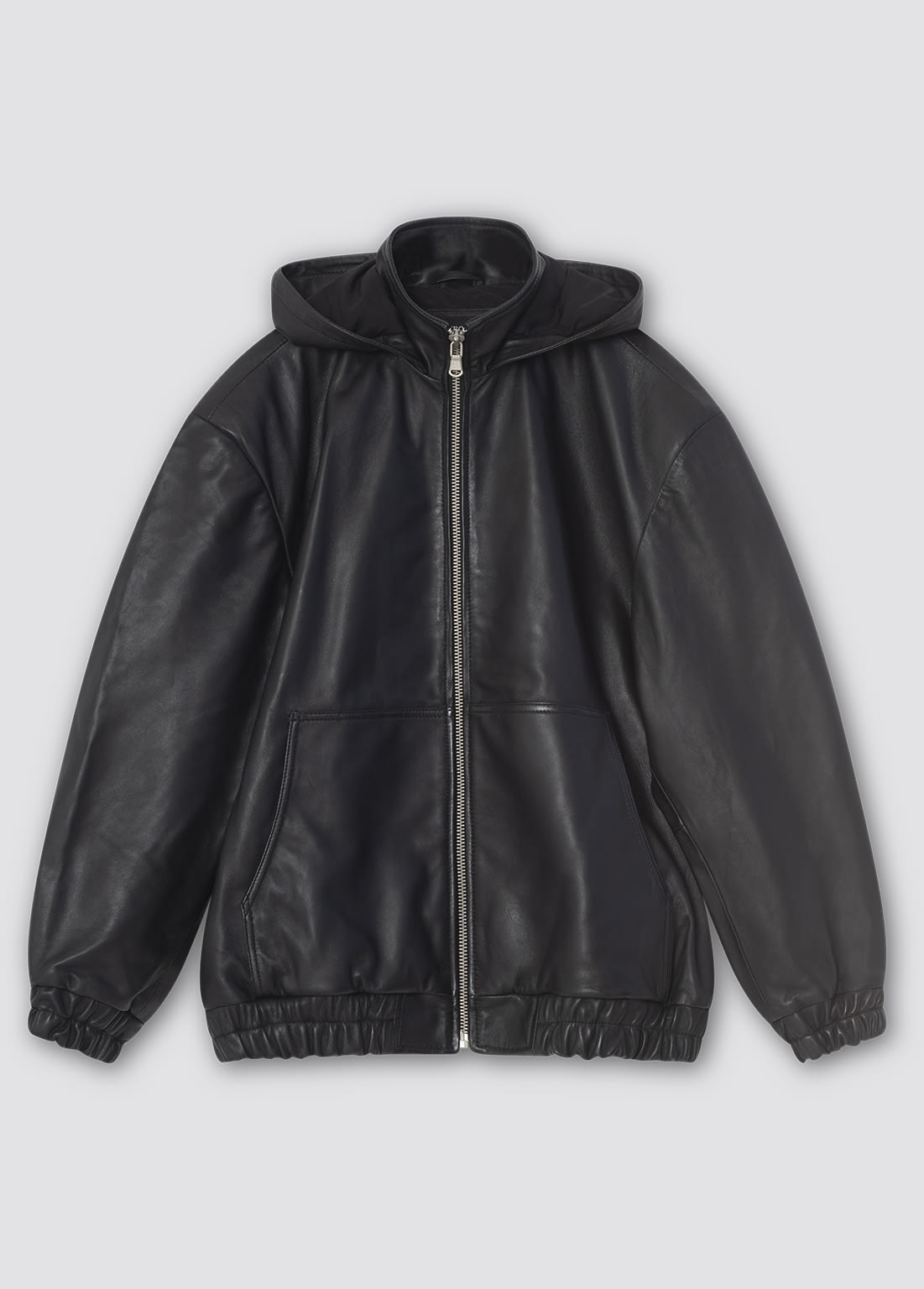 The Trinity Jacket is crafted from smooth leather with a refined, polished finish. It features a high stand collar, a clean zip closure, side pockets, and an attached hood, blending functional details with sleek, modern style for a versatile, statement-ready silhouette.