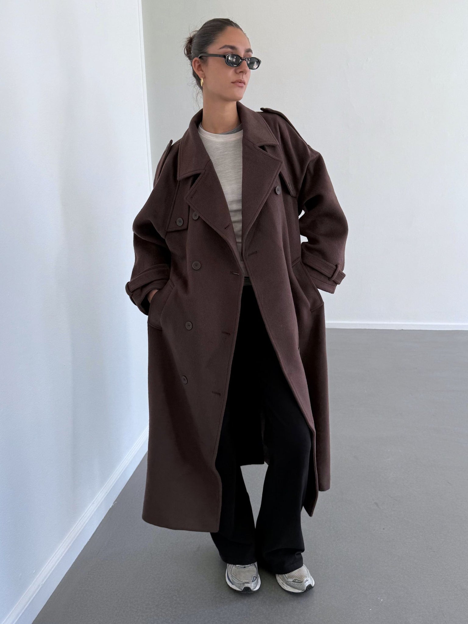 • Lang brun frakke med bælte og store knapper, kombineret med brede bukser. MEOTINE tilføjer stil og elegance.