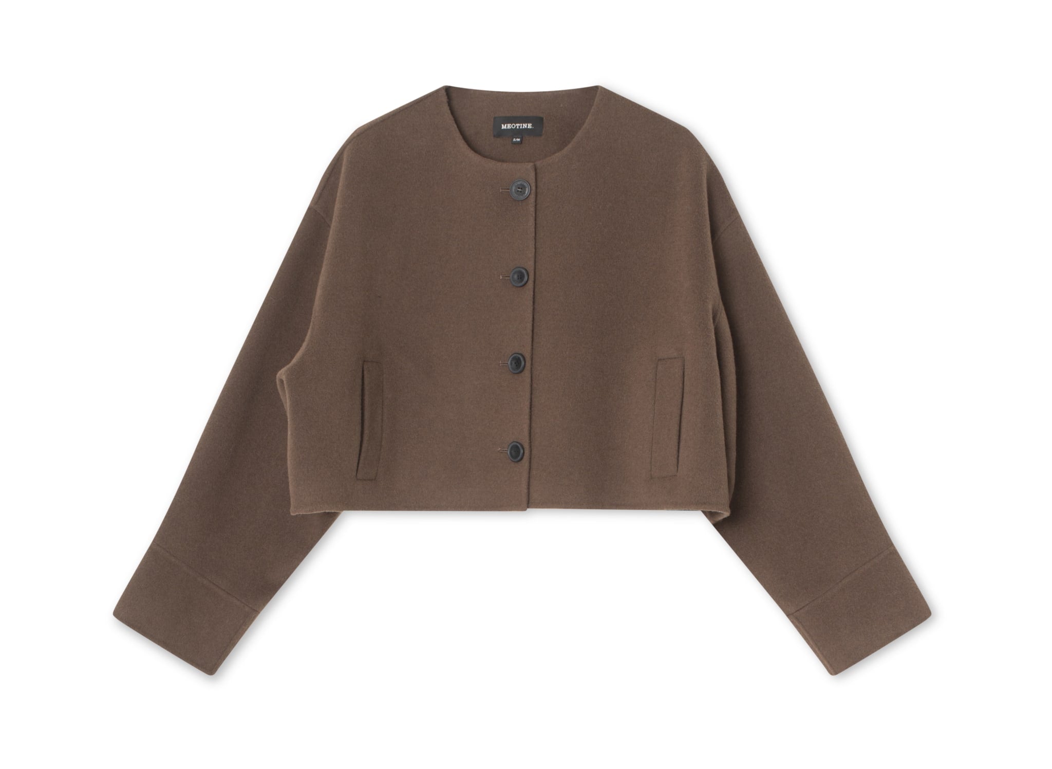 • Brun, kort cardigan med brede ærmer og en afslappet pasform, perfekt til lag-på-lag styling fra MEOTINE.