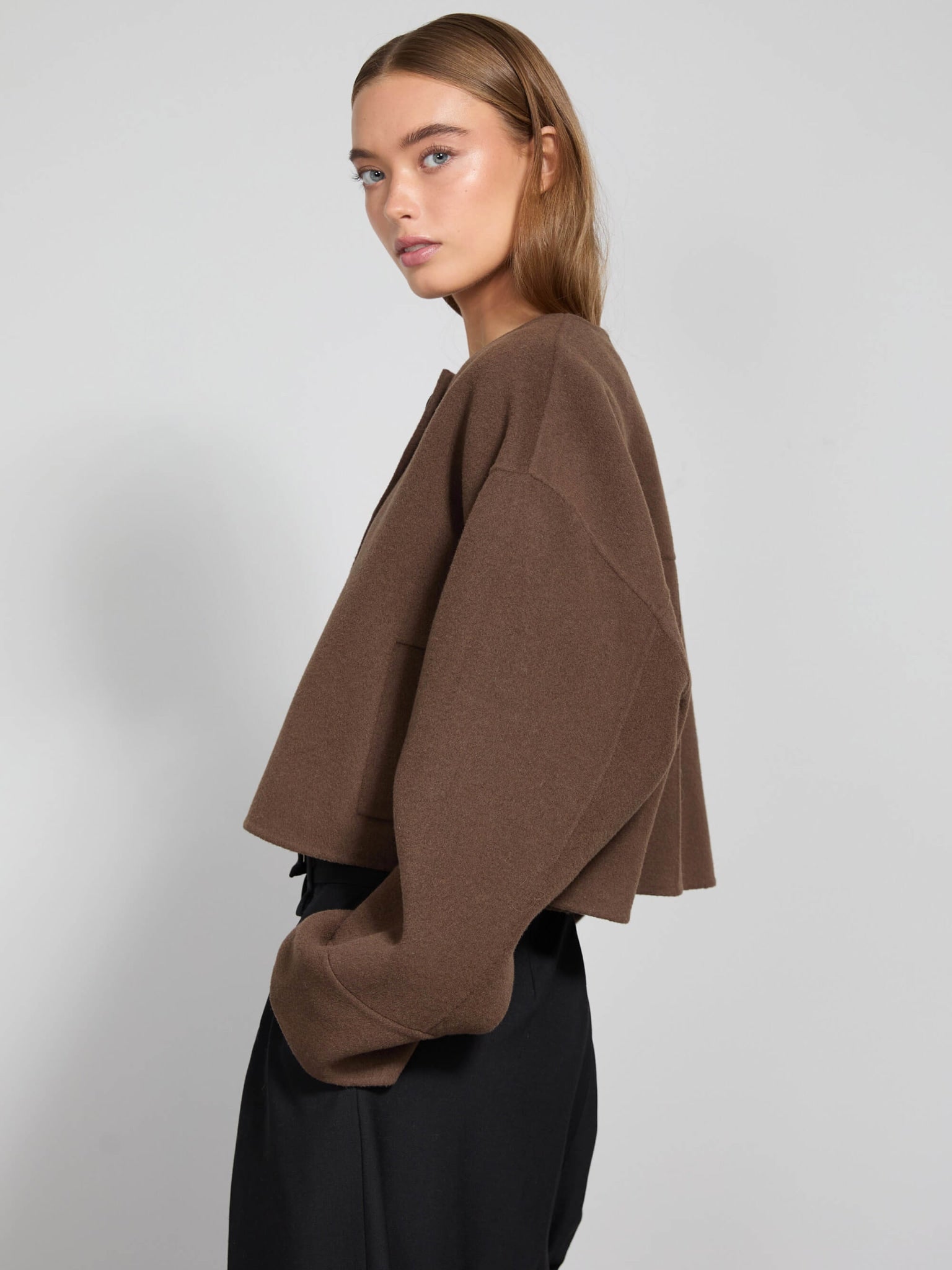 Cropped just above the hips, this jacket brings a contemporary twist to the classic wool coat – perfect for high-waisted trousers or layered over dresses for an elevated everyday look.