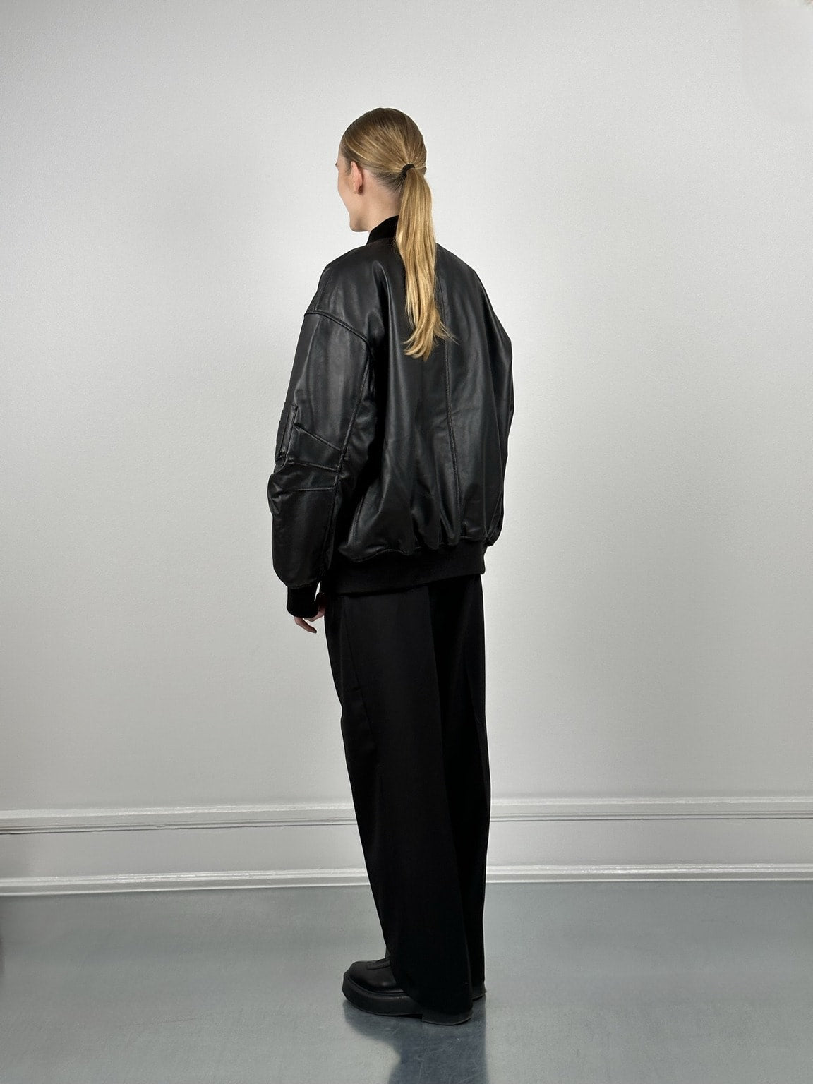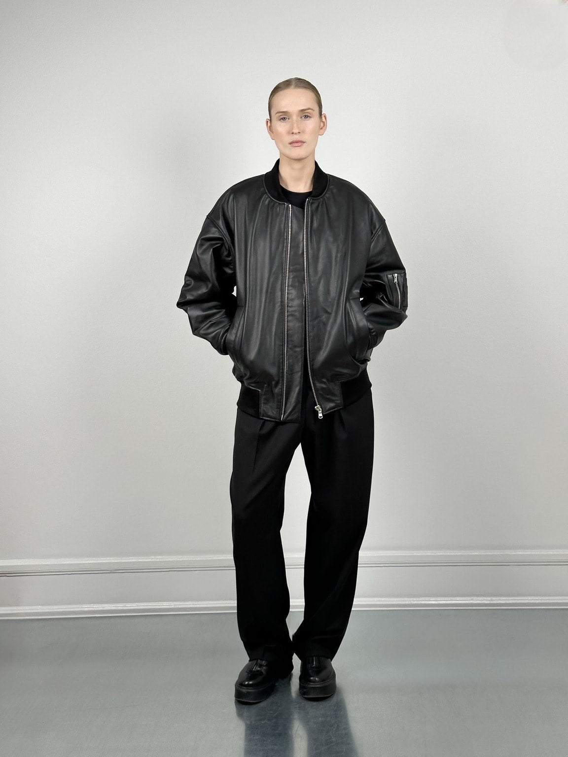 Bianca leather bomber, a stylish oversized bomber jacket crafted from luxurious and soft lamb leather. Designed for an oversized fit, this jacket features a sleek, non-padded silhouette that effortlessly complements any ensemble, two hidden front pockets and a zipper closure. Size GuideThe model is 1.77 cm and size 36 and she is wearing a S/M. The fit of this jacket is regular/oversized and we suggest that you take the size you are normally or size 1 size down for a more classical fit. size 36 = xs/ssize 38 = s/msize 40 = m/lsize 42 = l/xl