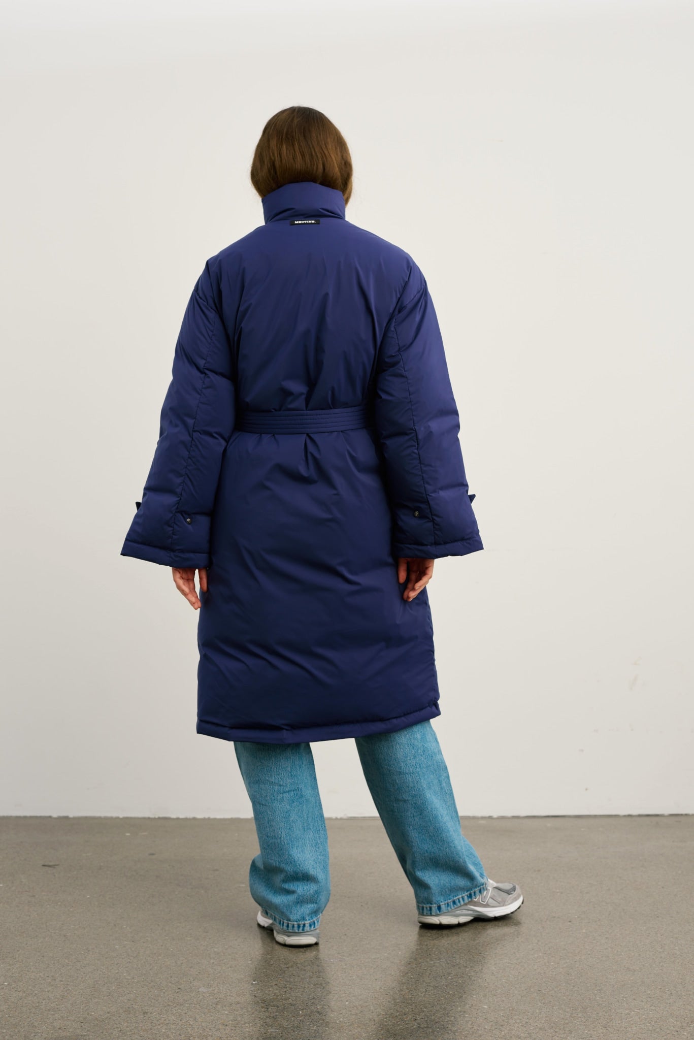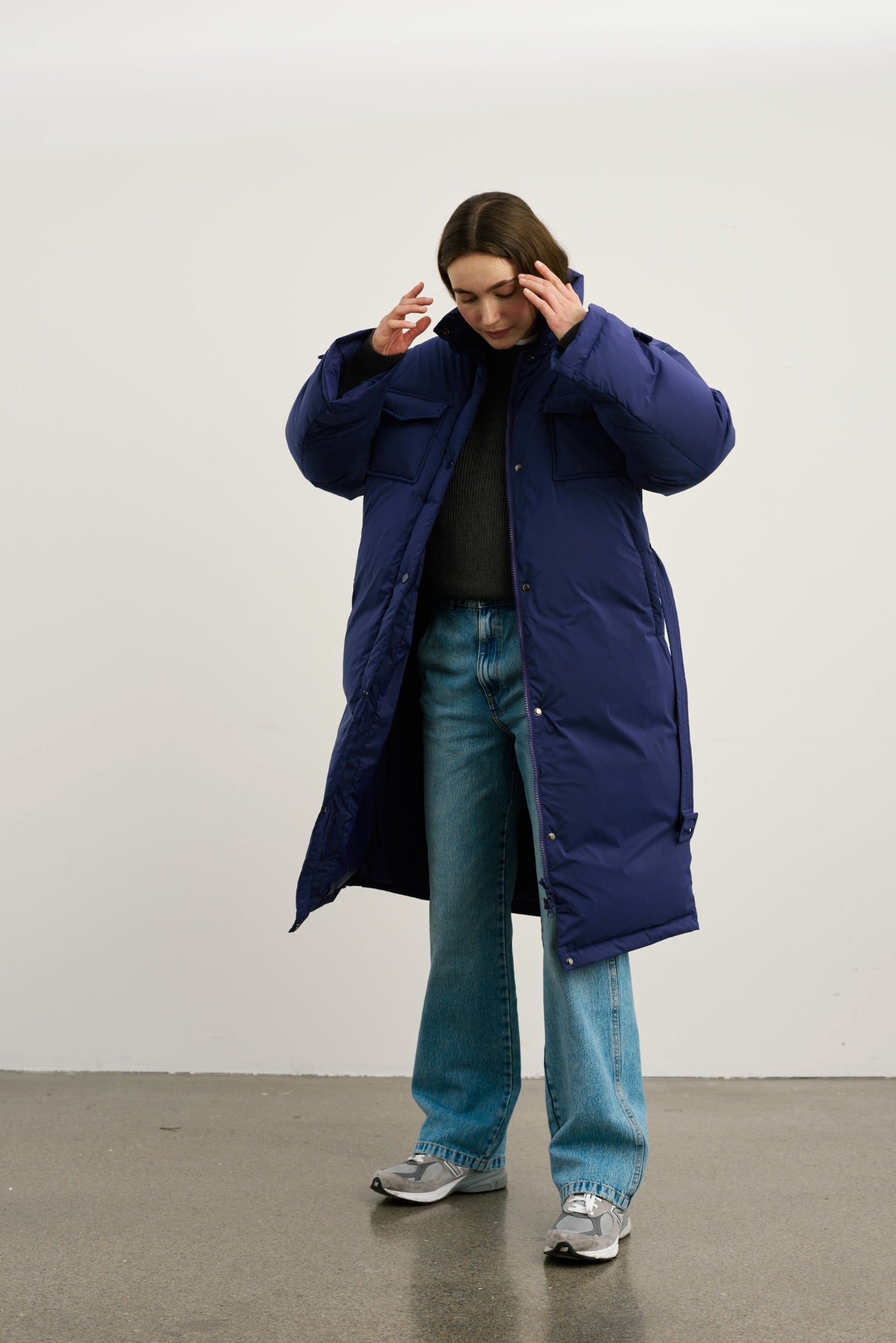 The Emma is an oversized, knee-length coat made in technical nylon with premium down filling. The waist belt and the funnel neckline with snap buttons makes the fit easy to adjust and layer. It is designed with two chest pockets and adjustable wrist bands.
