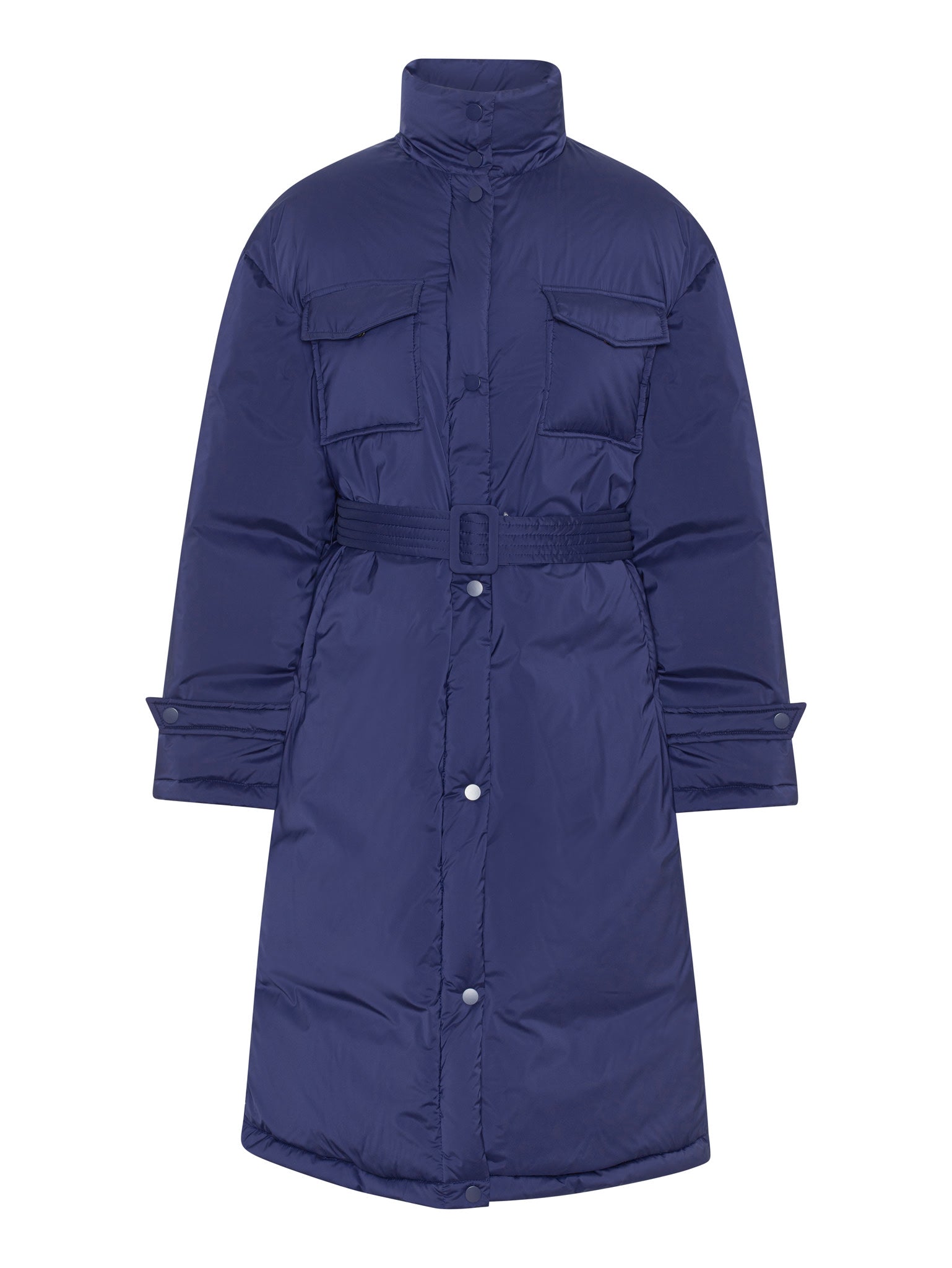 • Lang, navy blå dunjakke med bælte og store lommer, båret af en model med kort hår. MEOTINE tilføjer stil og komfort.