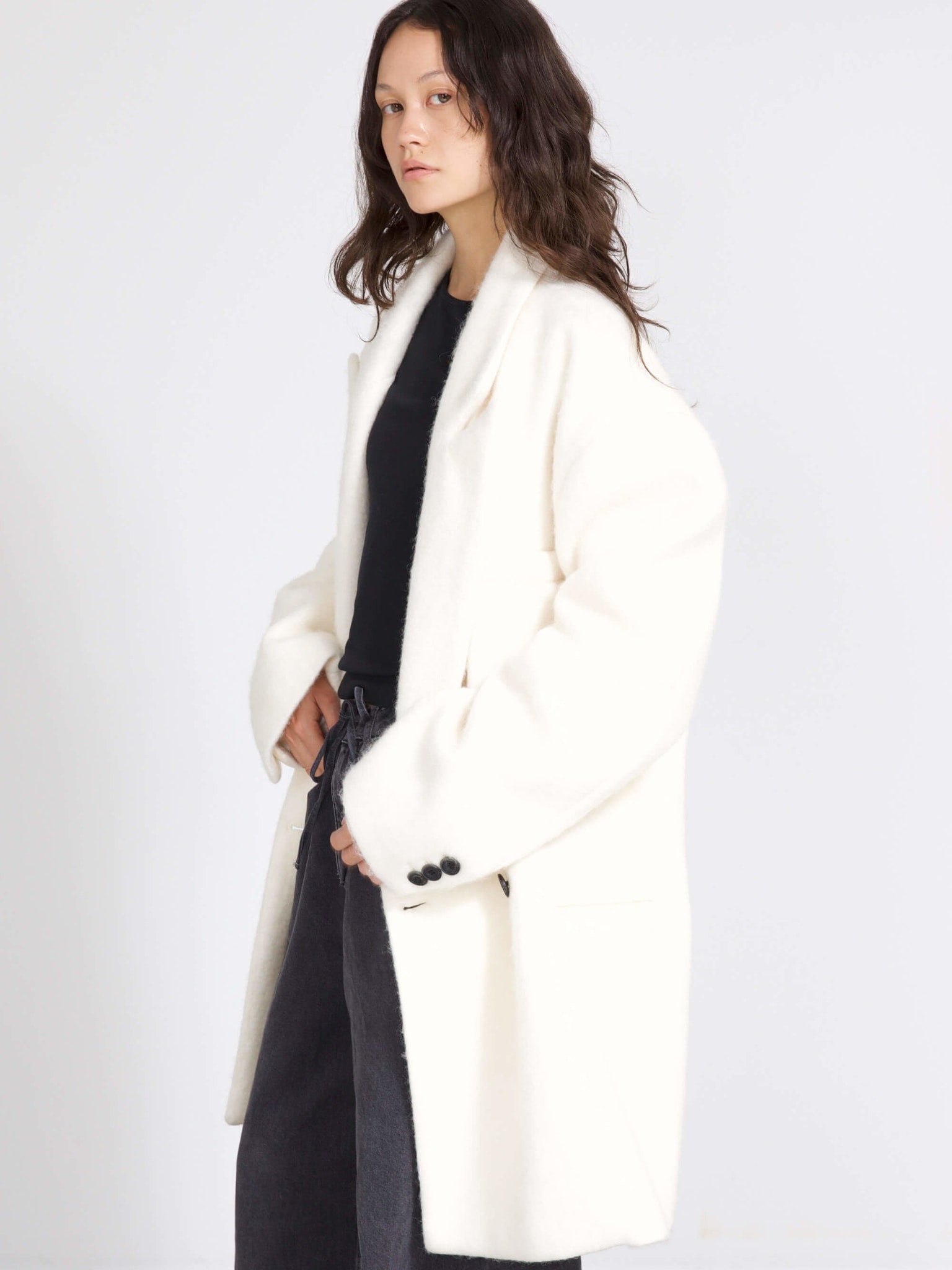 This coat is made from a soft, textured mohair wool blend in a light beige color, providing both warmth and a classic look. It's designed with a double-breasted front and large buttons, featuring a structured collar for a sharp silhouette. The coat’s length extends to mid-calf.