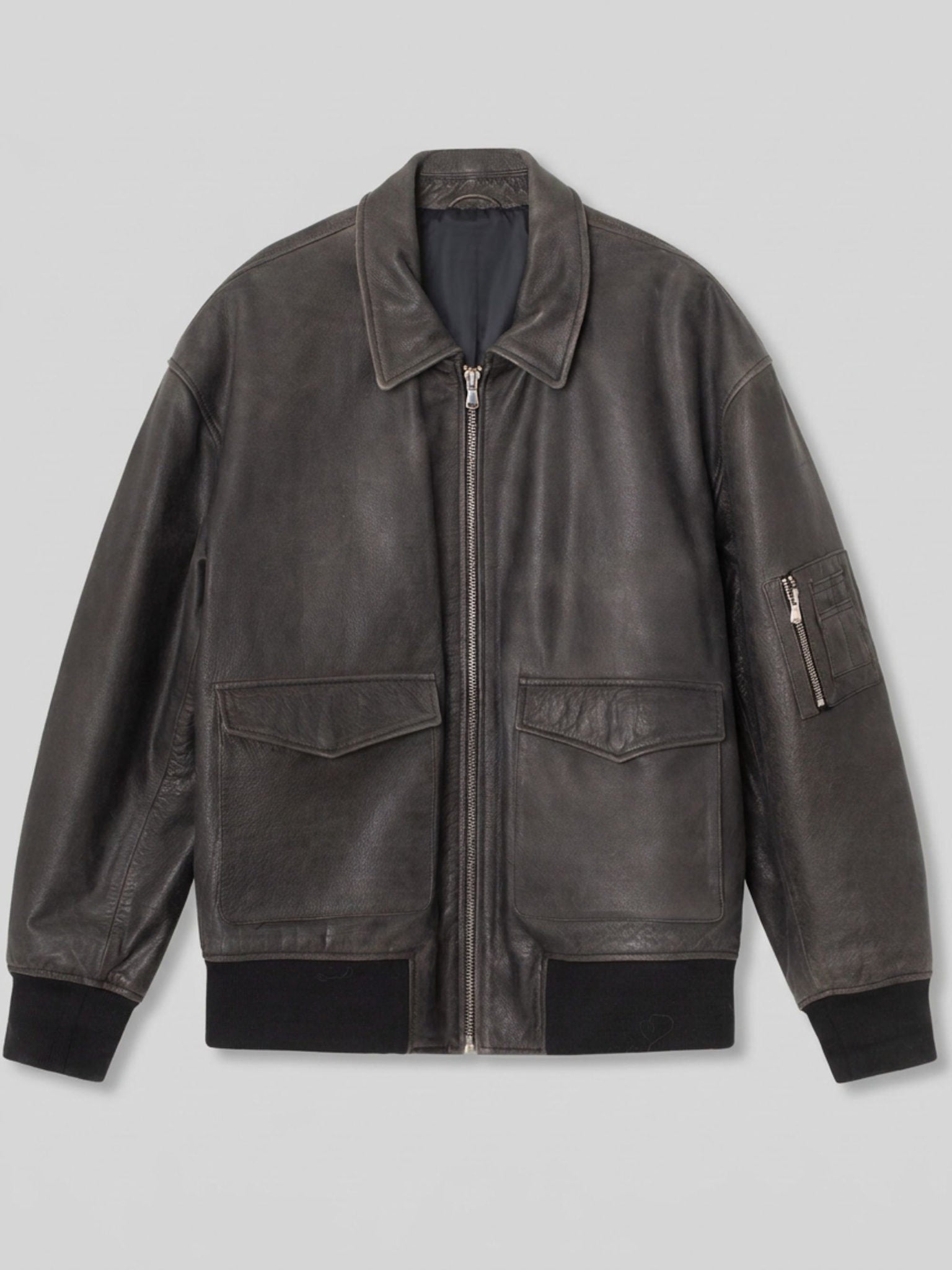 The Clyde leather bomber is designed for our "MEOTINE. Vintage" collection as a unisex leather piece. The jacket is made of solid cow leather with a thin lining and details of faded edges in black/grey shades for a vintage look, making every jacket unique. This piece is designed with an oversized fit featuring a front zipper and two front pockets. Clyde is a must-have for those seeking to add a touch of vintage elegance to their wardrobe.