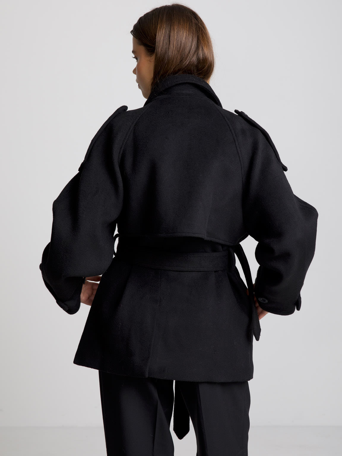 The Bea is a double-breasted jacket in wool mix with a thin lining. It is shaped to an oversized silhouette with lapel collar, shoulder and cuff details, two hidden front pockets, high slits and storm flap at the back. Wear it with or without the optional belt to embrace an oversize look or highlight the waist.