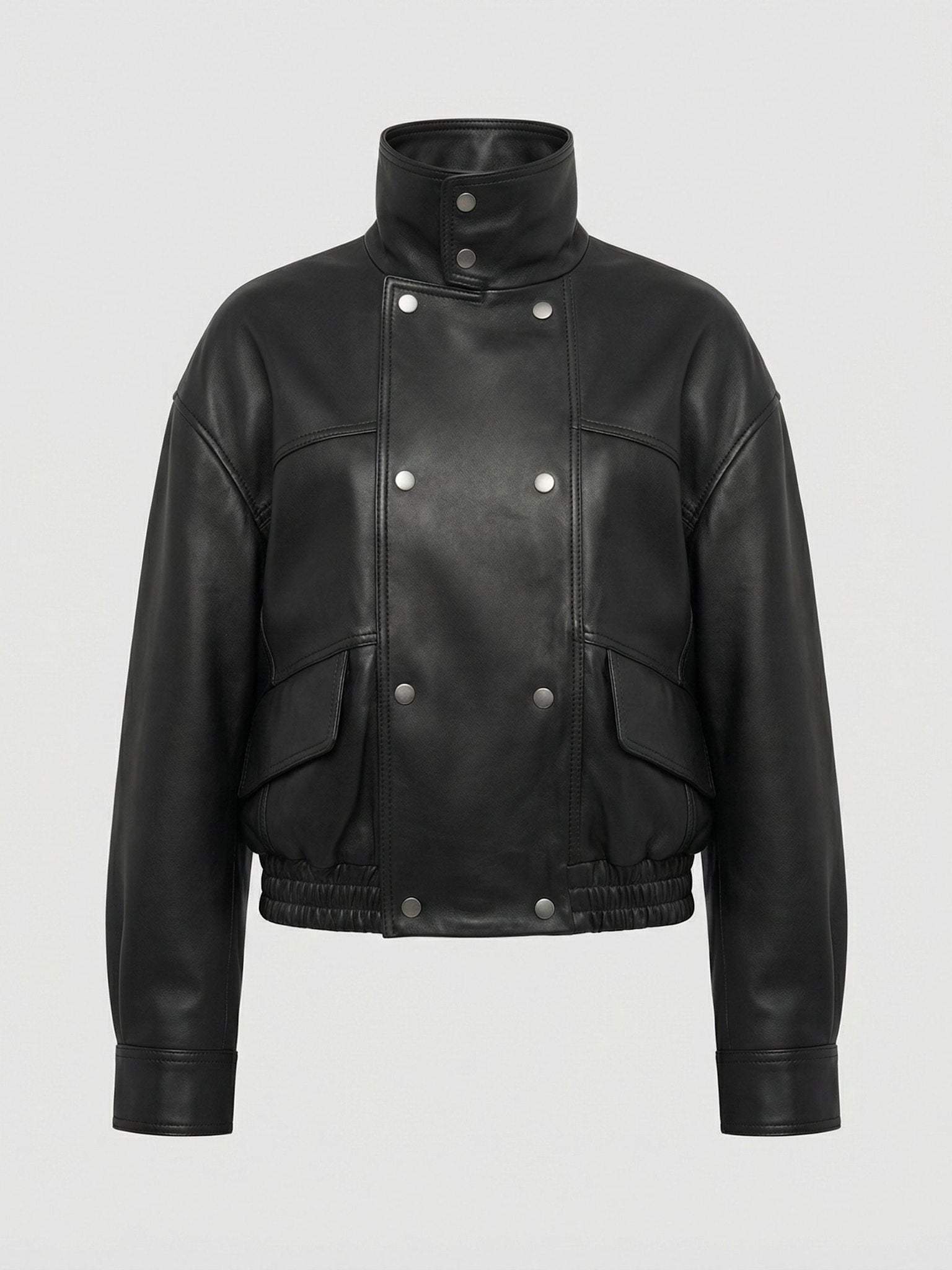 The Indie Jacket is crafted from smooth leather with a soft, structured finish. Designed in a relaxed silhouette, the Indie Jacket has a funnel-neck collar with snap-button detailing and a front snap-button closure. Oversized flap pockets, dropped shoulders and an elasticated hem enhance the structured yet effortless feel. A bold, utility-infused statement for the modern wardrobe.
