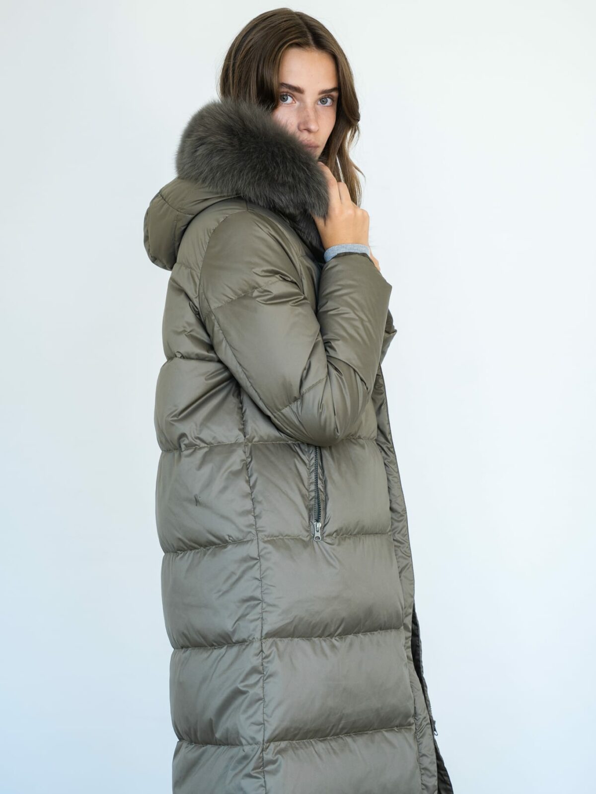 Long fitted coat with down-fill and blue fox fur hood - the fur is detachable. The coat has a front zip closure and zipped side pockets. The coat is made in a light technical fabric that is water repellent.