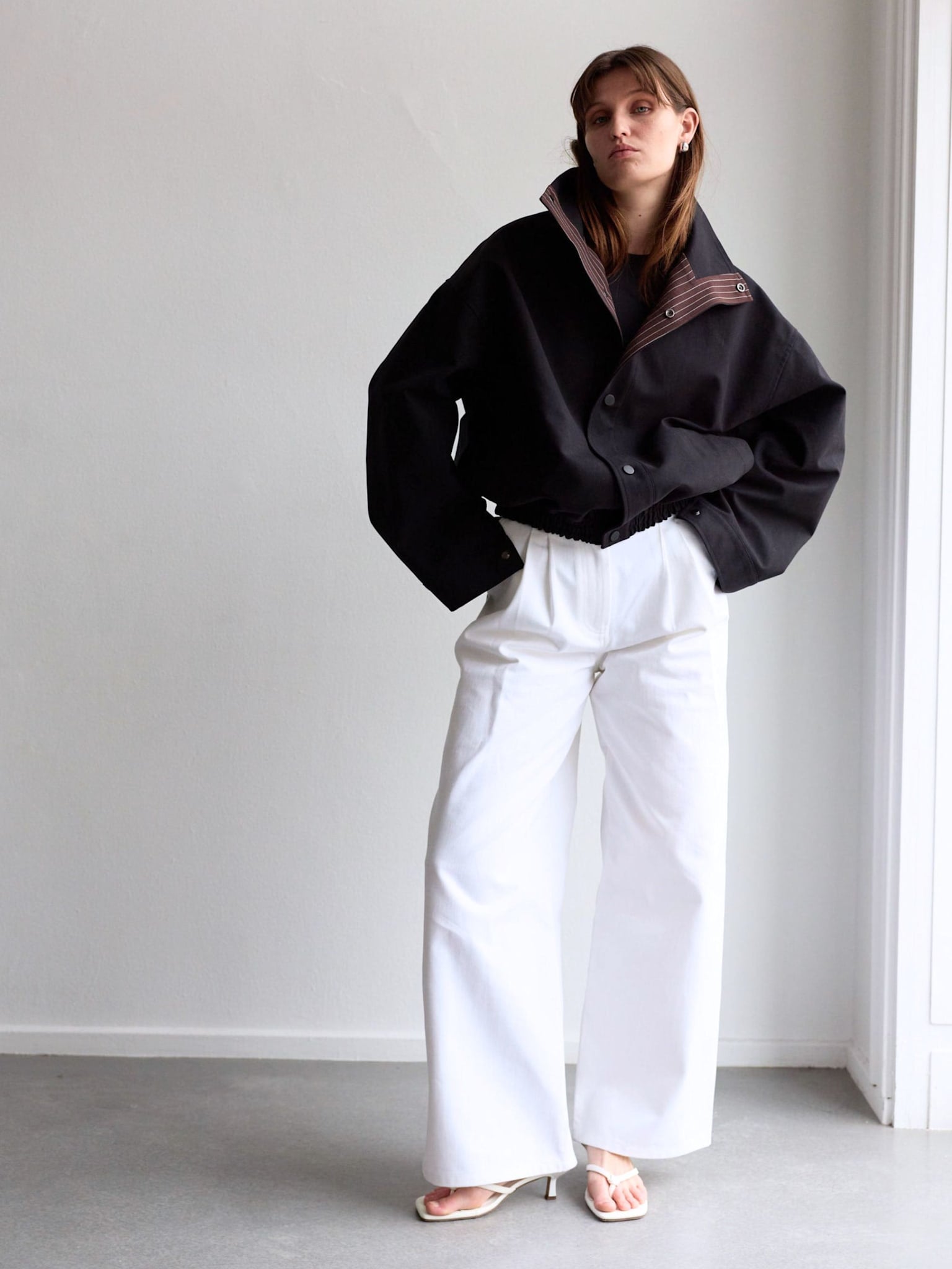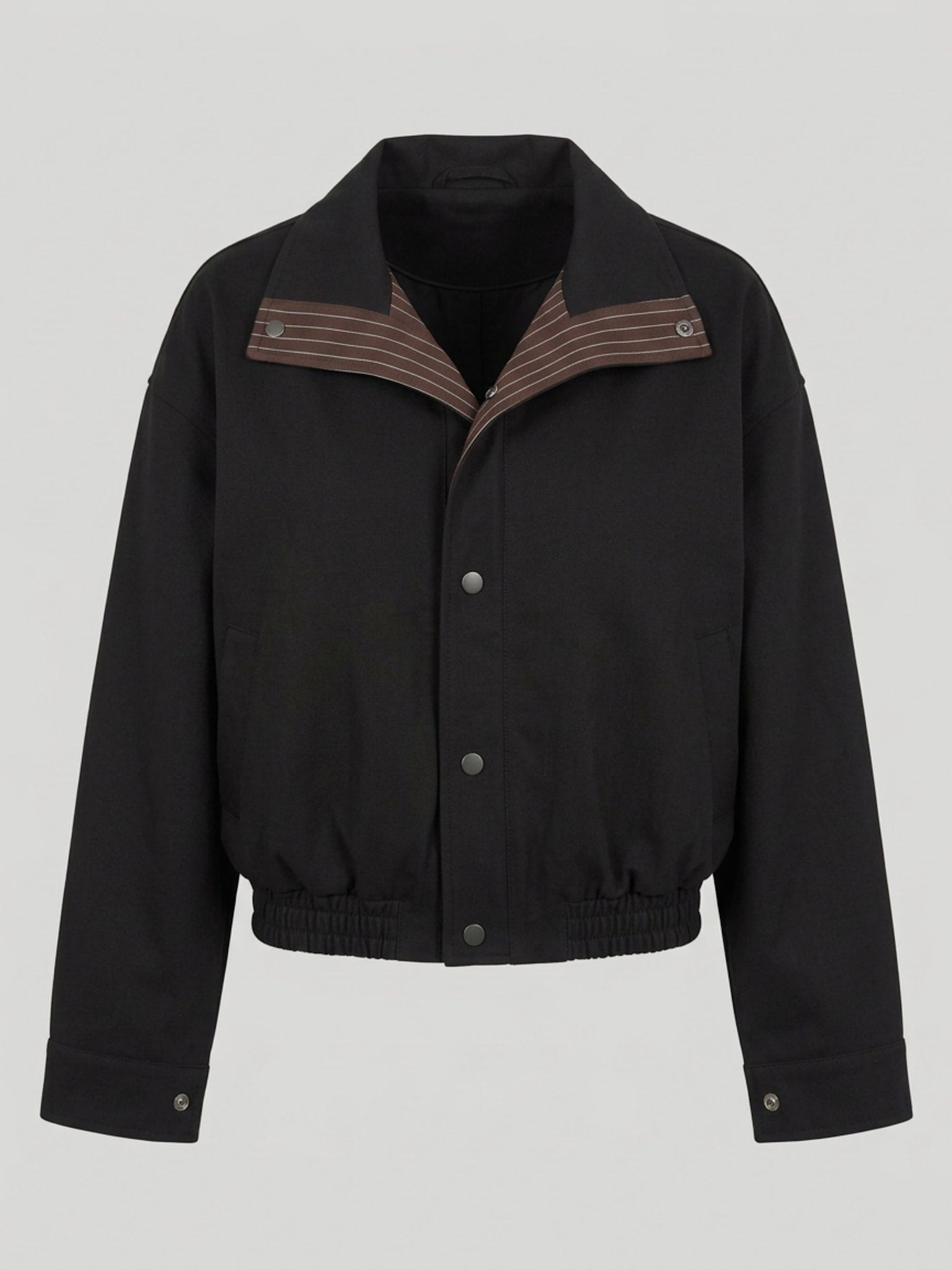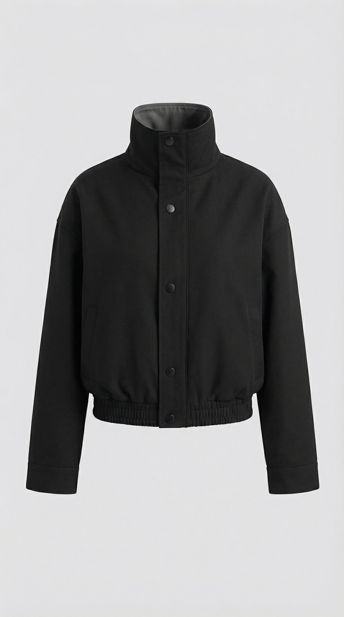 The Ezren Bomber Jacket is made from soft, structured cotton with a matte finish. Designed in an oversized silhouette with exaggerated volume in both the body and sleeves, it features a high stand collar and a snap button closure at the front. The interior lining at the collar and front features subtle stripes, adding a refined, shirt-inspired detail. An elasticated hem enhances the shape, creating effortless yet balanced proportions.