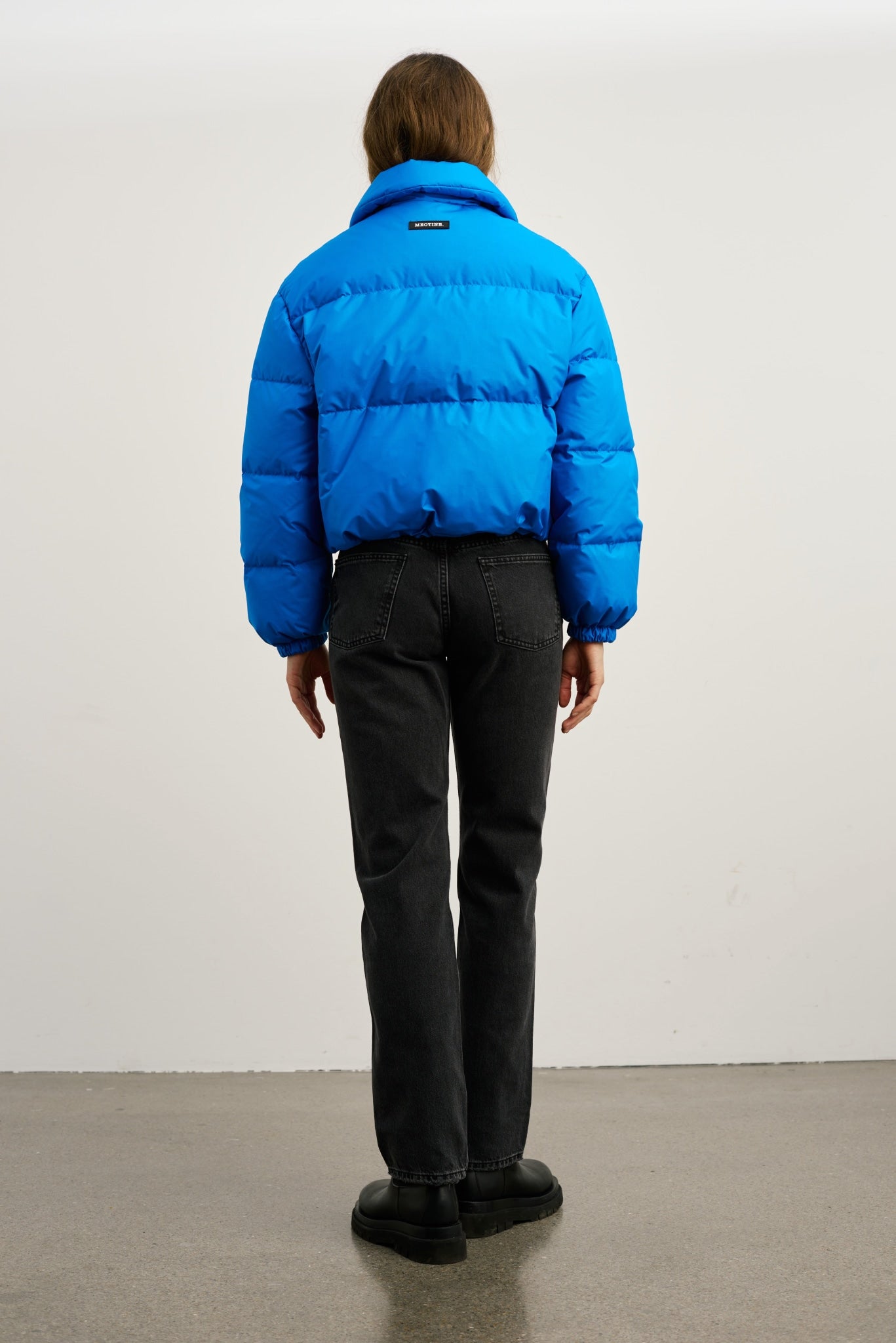 • Blå, kort pufferjakke fra MEOTINE, stylet med sorte jeans og støvler, præsenteret af en model i et lyst rum.