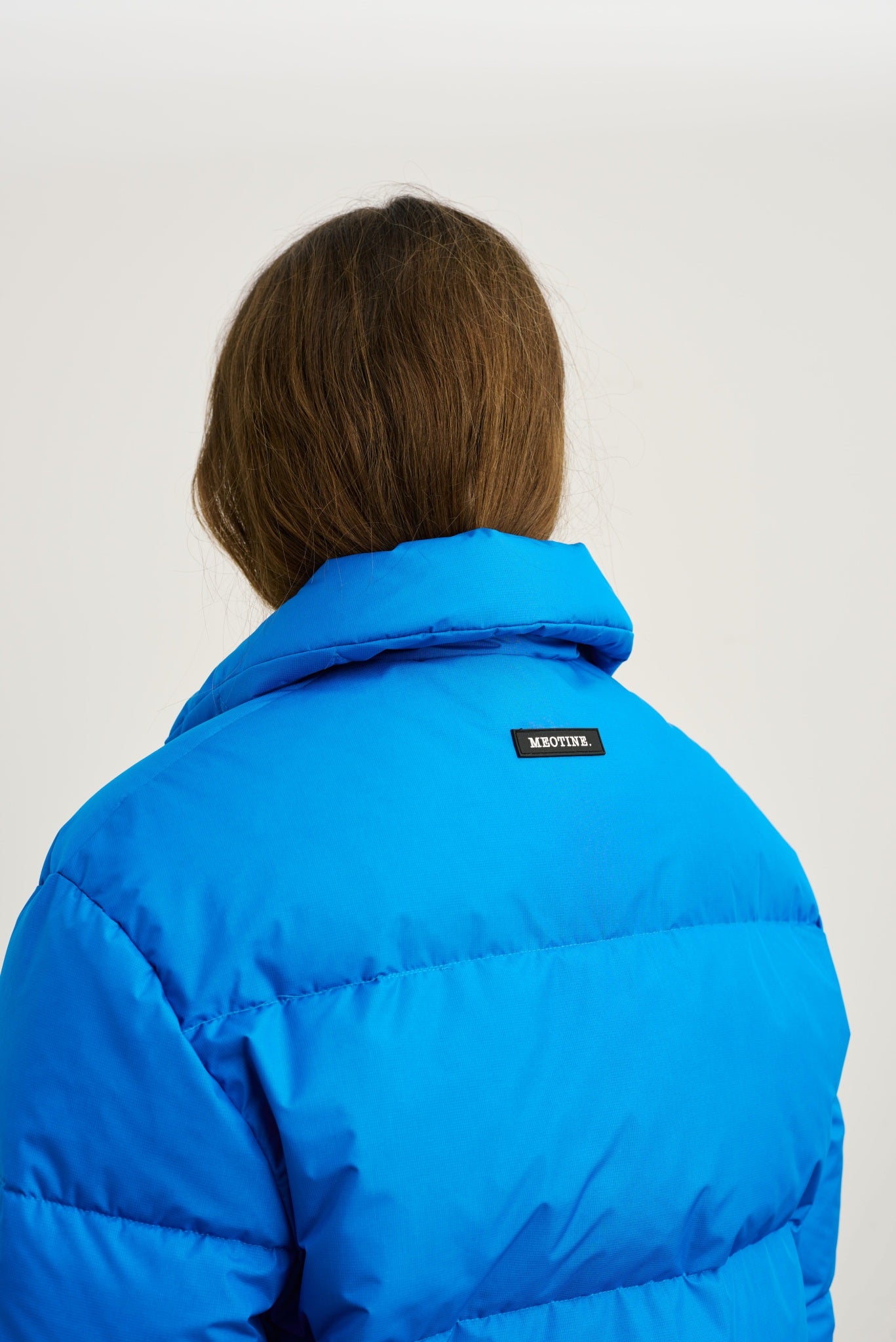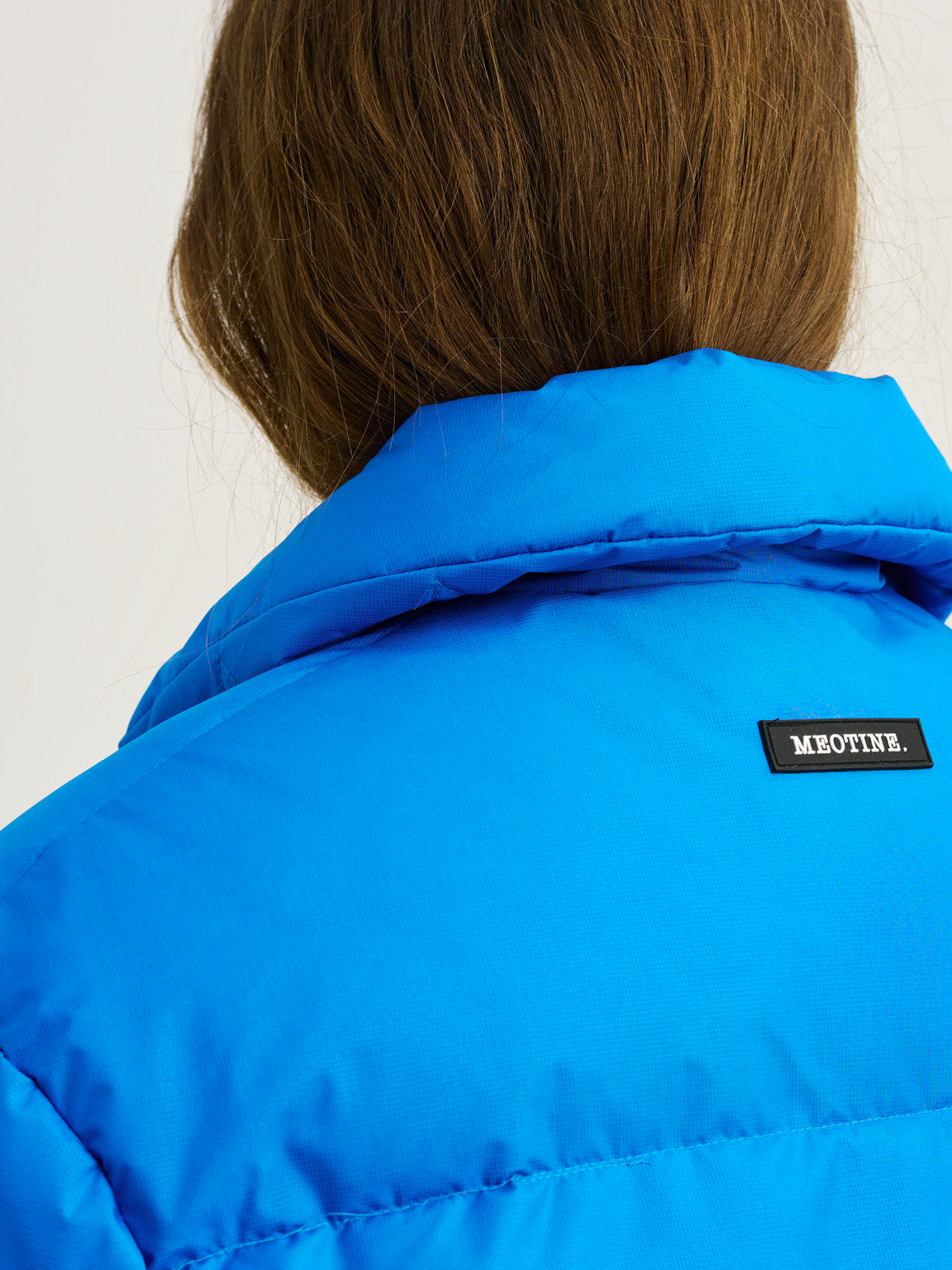• Blå dunjakke med høj krave og MEOTINE-logo på ryggen, set bagfra. Perfekt til kolde dage.