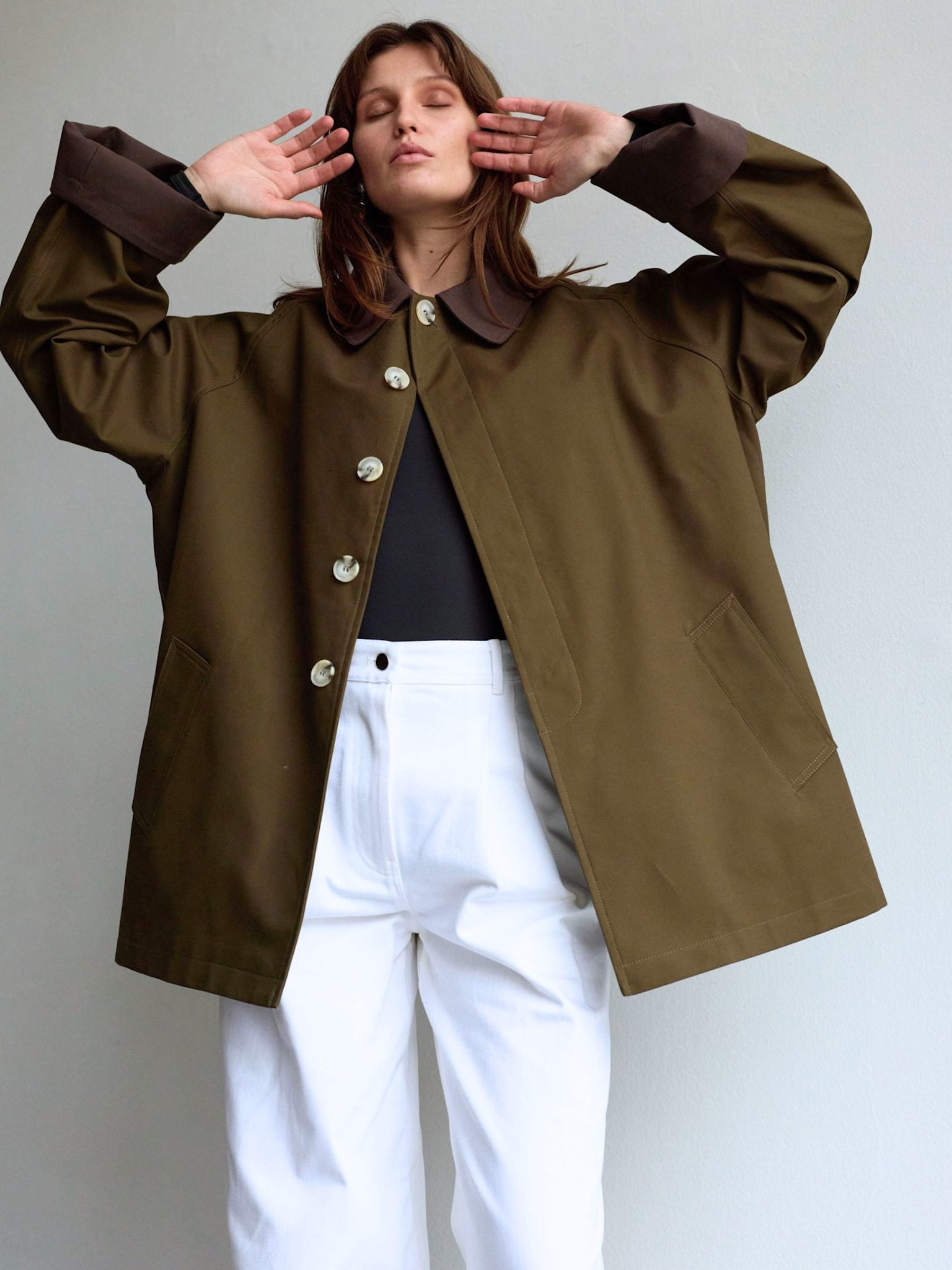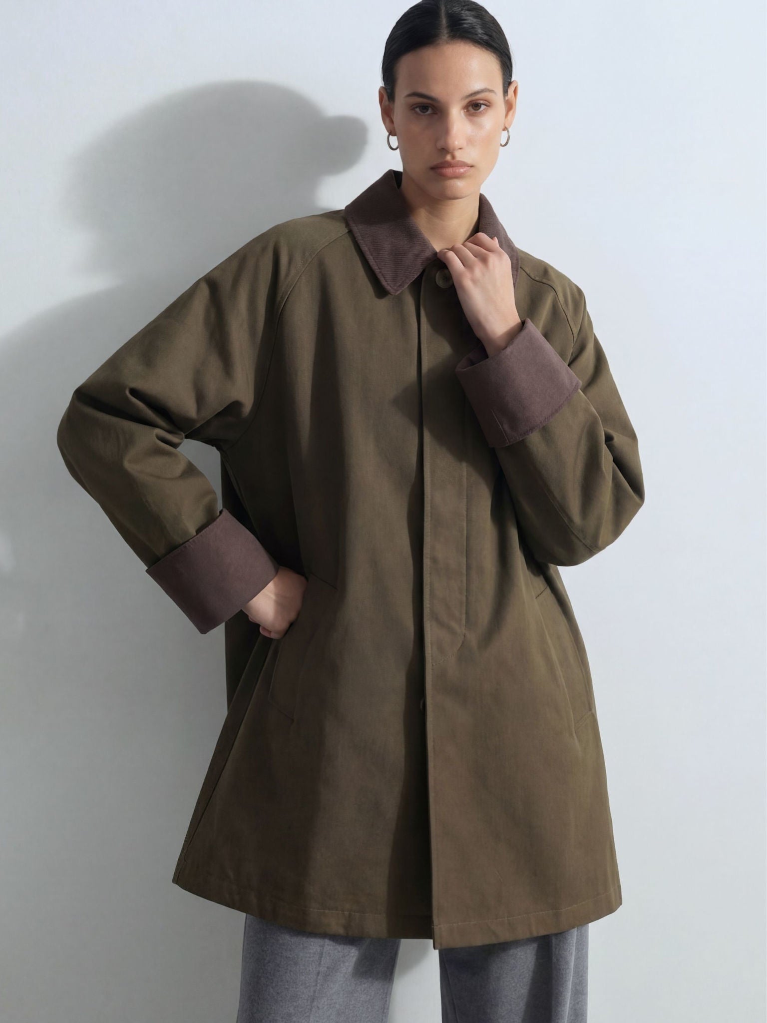 The Freya Jacket is crafted from structured cotton with a smooth, durable finish. Designed in a relaxed, A-line silhouette, it features a concealed button-front closure and contrasting collar and cuffs. Raglan sleeves enhance an effortless fit, while discreet side pockets maintain a clean expression. A timeless outer layer with subtle heritage references.