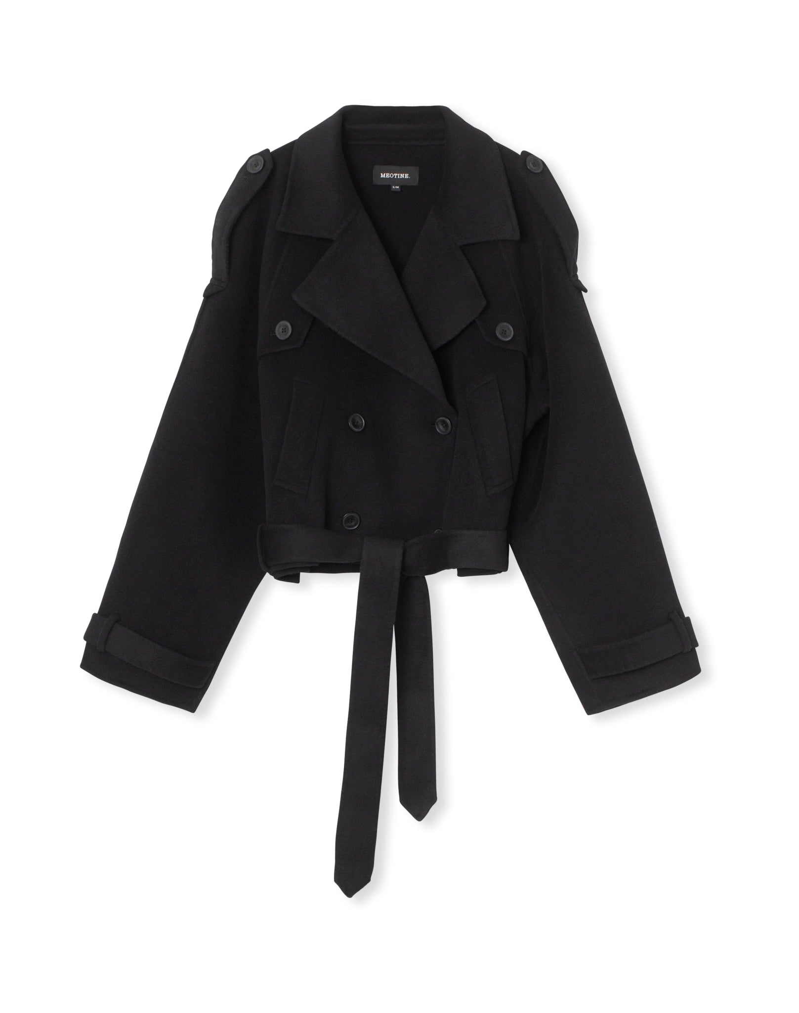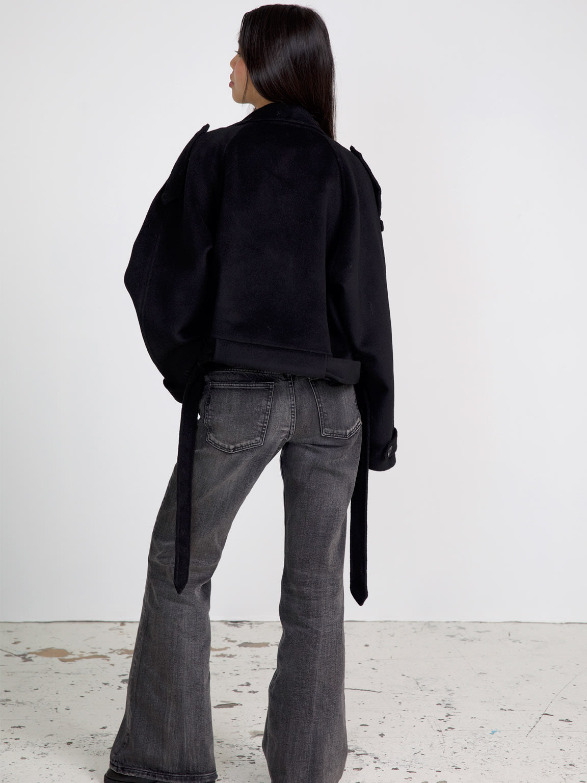 The John is a short trenchjacket with double-breasted button closure cut from double faced wool. The coat fits oversized offering a relaxed silhouette, and it is designed with two front pockets and button details on the shoulders and cuffs. John comes with a belt to highlight the waist or to wear open for a more casual look.
