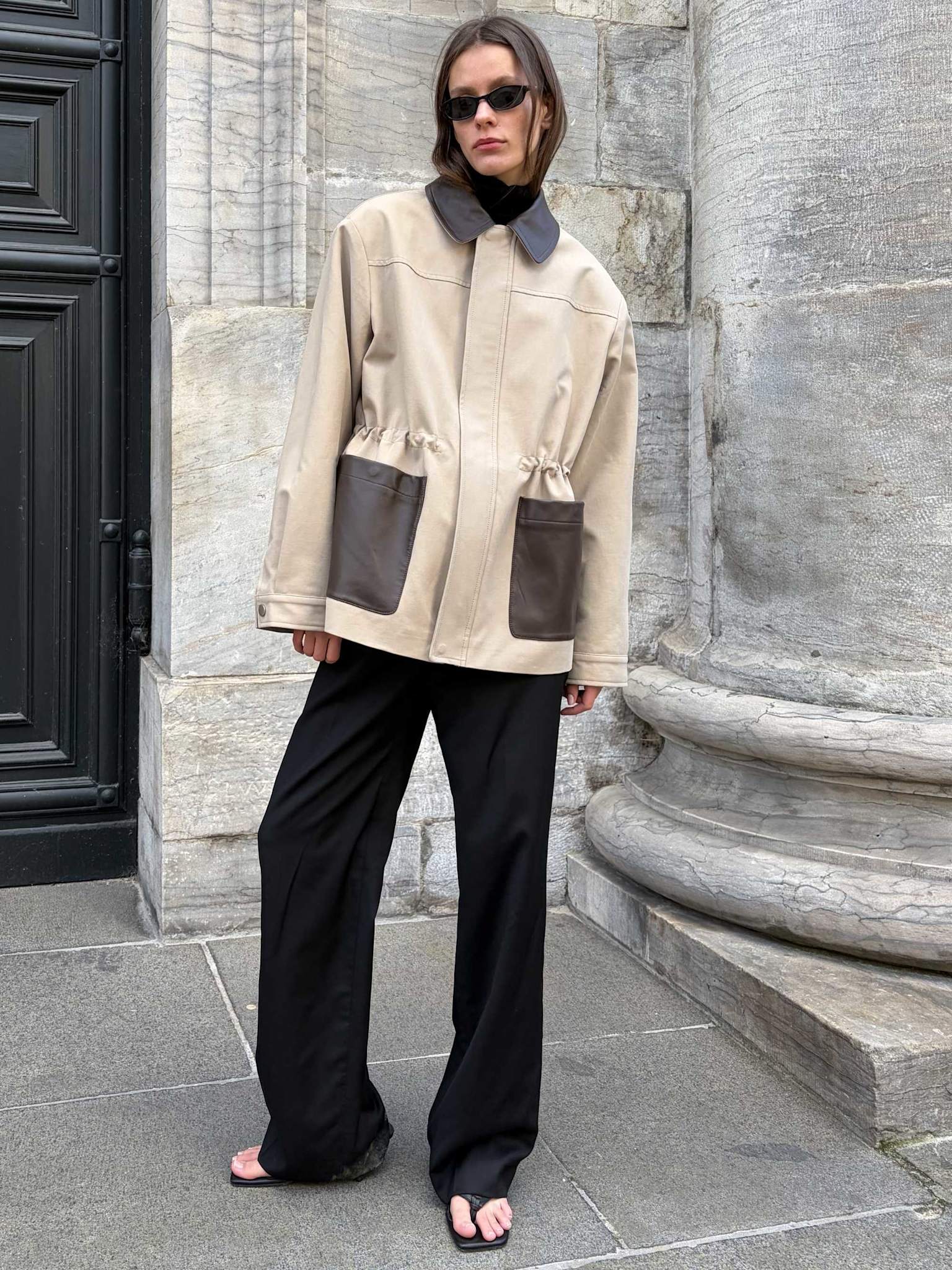The Maris Jacket is crafted from structured cotton with a durable, sleek finish. Designed in a regular silhouette, it features a front closure with a concealed zipper and hidden snap buttons, complemented by a contrasting leather collar for a refined touch. Large leather patch pockets and an elasticated waist create a balance between utility and femininity. A modern transitional piece with effortless sophistication.