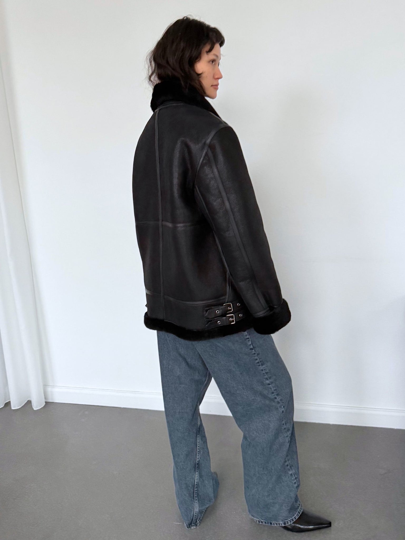 Morgan jacket is a black'n'black shearling jacket with matching shealing details on the collar. The Jacket is designed to an oversized fit and has a zipper closure and two hidden front pockets.