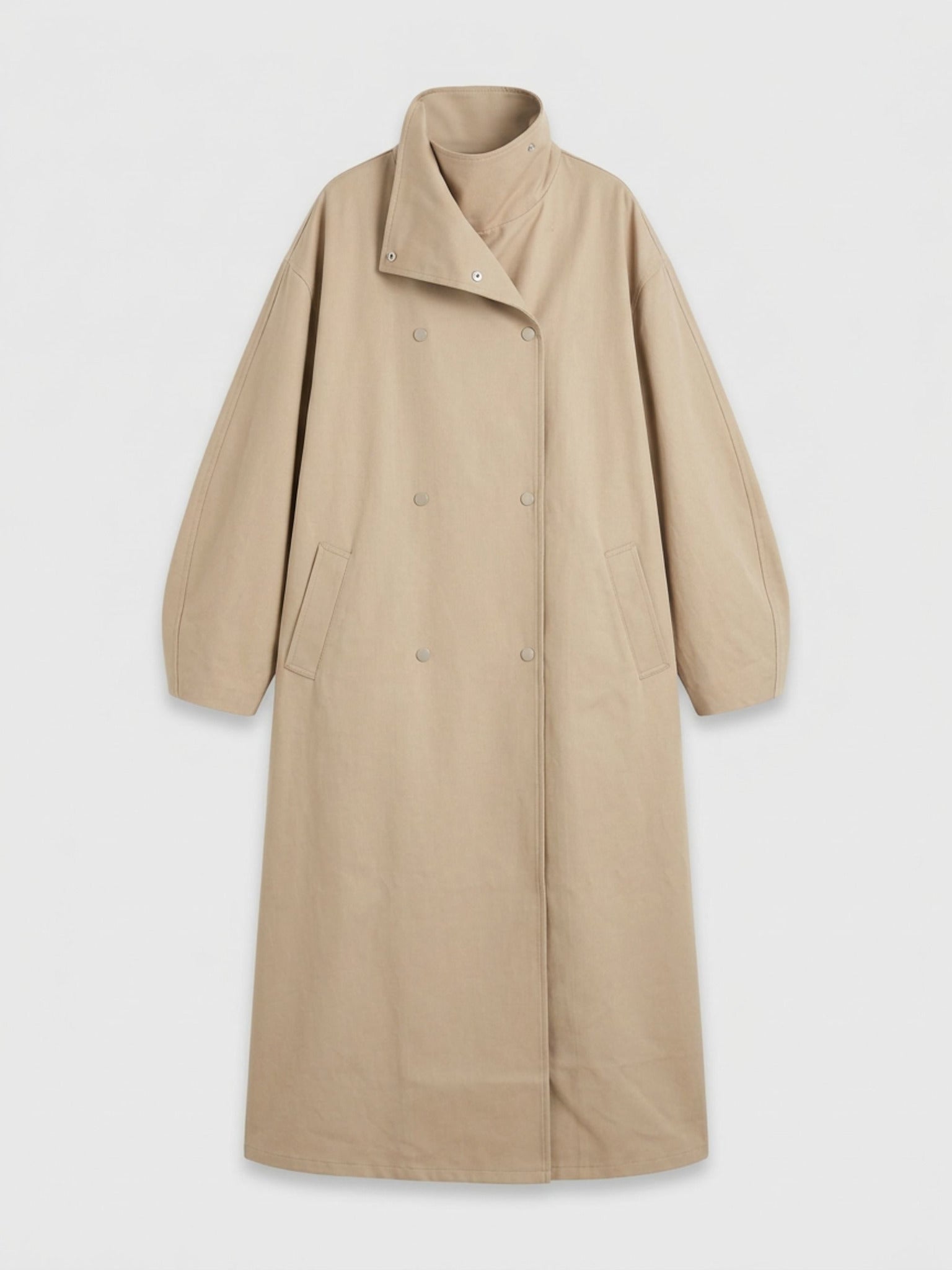 The Solan Coat is crafted from structured cotton with a smooth, matte finish. Designed in an oversized silhouette with exaggerated volume through the body and sleeves, it features a sculptural funnel neck and a double-breasted front with snap buttons. Cut to an ankle-length it creates a bold, elongated shape with a clean, architectural expression. A statement outer layer defined by modern minimalism.