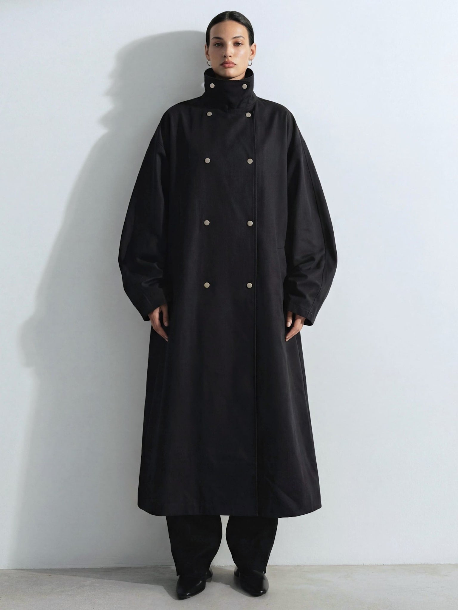 A Modern take on the classic trenchcoat is crafted for a clean, contemporary look with a high collar and button-down front. It features two practical pockets and a waist-defining belt, allowing you to cinch for a tailored silhouette or wear loose for effortless fit.